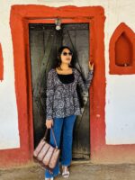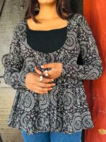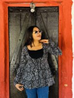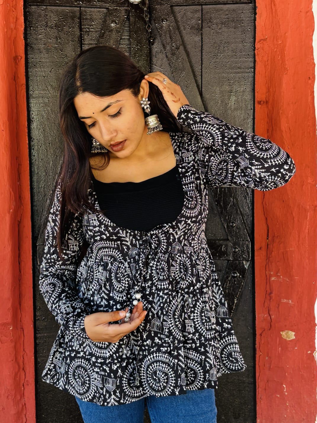 our elegant pure cotton black kurti with white prints, designed in a flary style that gives a beautiful fall. It can also be worn as a shrug, and the front tie-up dori with pearl detailing adds a touch of charm and elegance.
